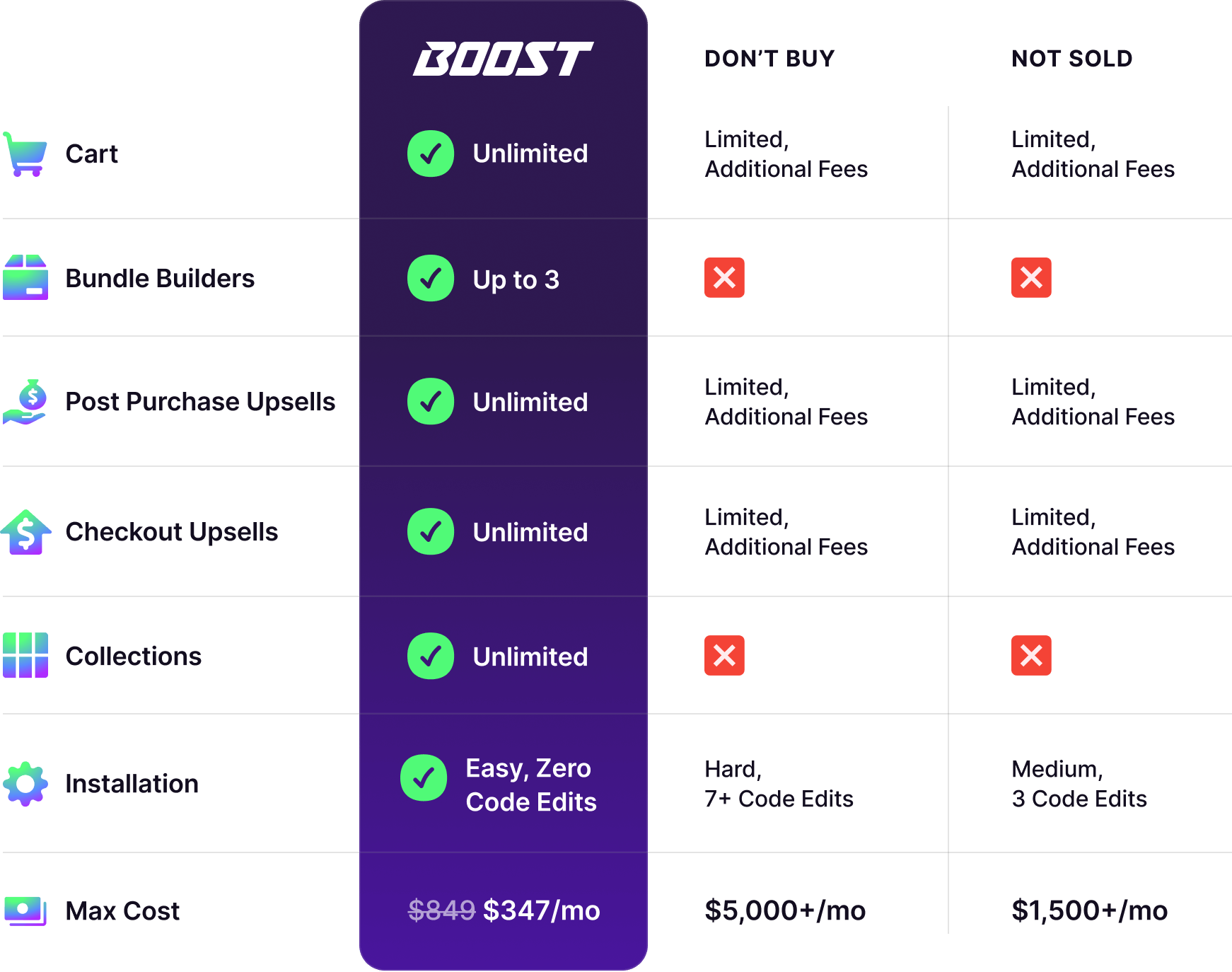 We've tried every cart app on the market, every upsell app too. None come close! Boost is the only all-in-one app that delivers.
