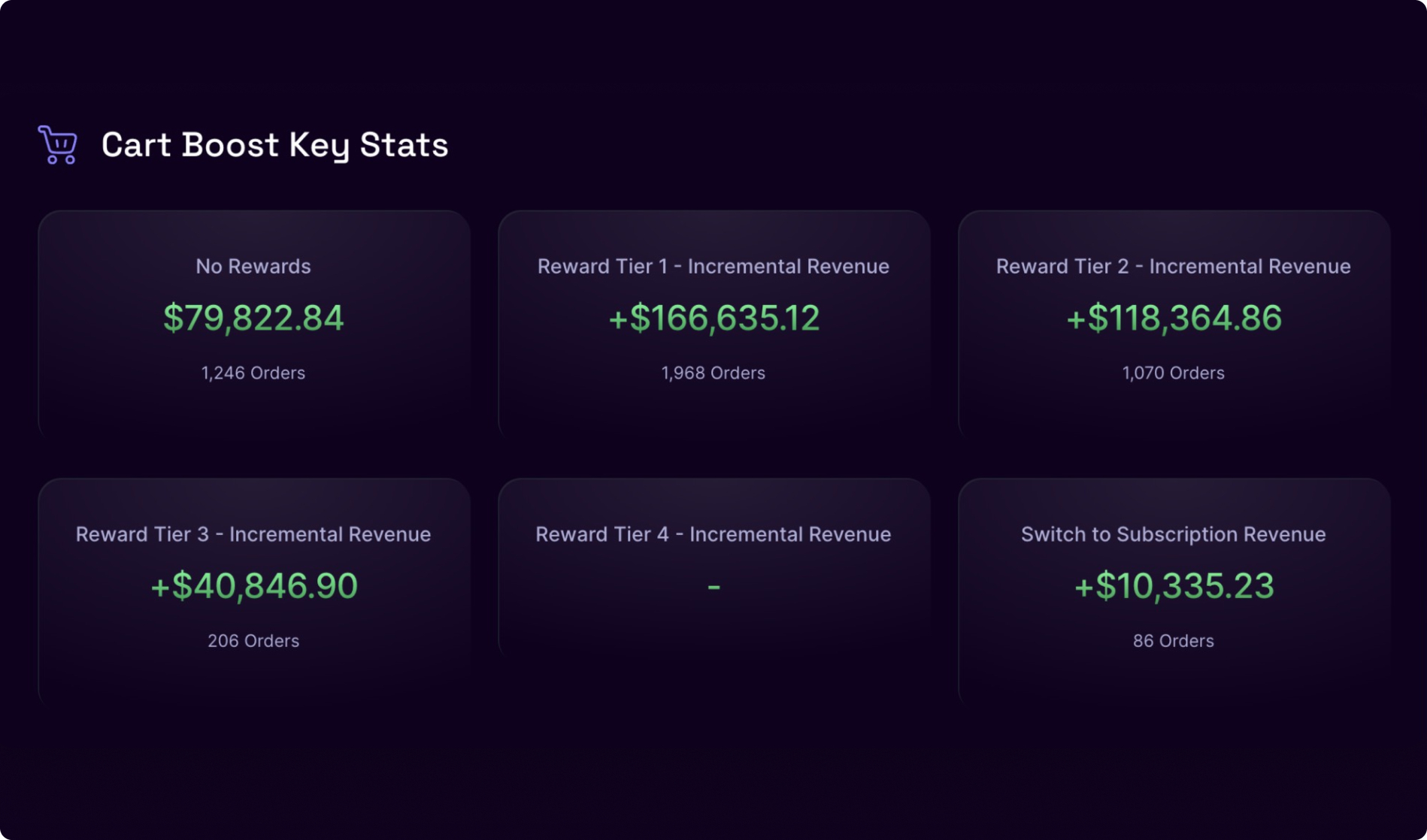 Boost includes Moneyboard, a comprehensive analytics dashboard that shows you exactly how much extra revenue Boost is generating for your store, broken down by feature.
