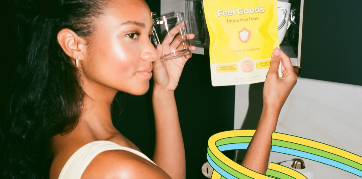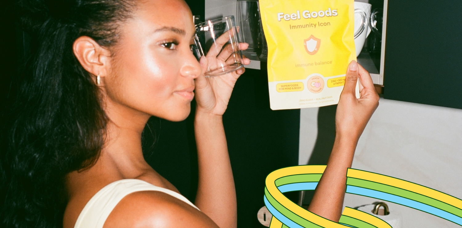 Feel Goods makes drink mixes for daily wellbeing, formulated with nutritionists and homeopathic experts. Their products use plants and fruits flavored with real fruit juice instead of sugar. The line includes Immunity Icon™, Gut Guardian™, Hydration Hero, HydraSip, and Whisk Taker, sold in 15-packs and 90-serving tubs, with flavor set bundles and merch available at feelgoods.co.